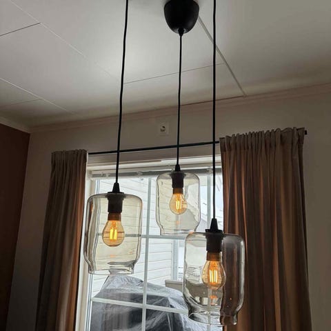 Nydelig taklampe med 2 tilhørende vegglamper selges. Kan justere lengden på taklampen. Pent og lite brukt.