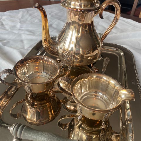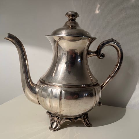Antikt sølvbelagt kaffe- og tesett, sannsynligvis produsert av den kjente tyske produsenten WMF (Württembergische Metallwarenfabrik) tidlig på 1900-tallet???