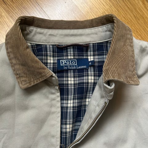 Selger en stilren og klassisk bomull Polo Ralph Lauren jakke i størrelse XL. Jakken har den ikoniske Harrington-/swingtop-stilen med brodert Polo-logo på brystet og rutete fór på innsiden.