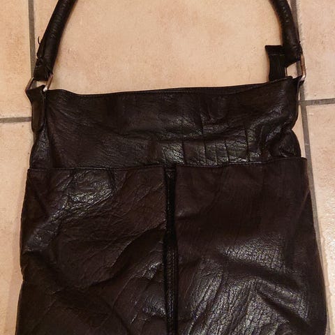 Sort reiseveske i ekte skinn selges. Mange praktiske lommer på utsiden av vesken. Målene H30/B45/ D25cm. Meget pent bruk, ingen avvik,foret er rent og pent.