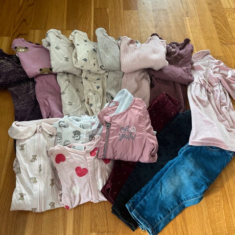 Diverse fleece barneklær for jente i størrelse 110. Forskjellige merker som Bergans, Stormberg, H&M. Pakken inneholder ulike plagg i flere farger, blant annet fleecejakker, fleecebukser og heldress, tot 10 plagg. Klærne kommer i flerfargede varianter som blå, lilla, rosa og røde toner. Egnet som hverdagsklær og mellomlag for barn i ca. størrelse 110 - 116.Et par ullbukser og en ullgenser er også i pakken.