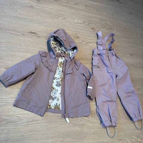 Wheat parkdress for jente i størrelse 140. Sett med jakke og bukse i brun polyester. Jakken har hette med avtakbar fuskepels og blomstrete mønster, glidelås og trykknapper foran samt lommer. Mykt fôr på innsiden for ekstra komfort. Buksen er ensfarget brun med strikk nederst i bena og justerbare fotstropper. Egnet som yttertøy til bruk i kjøligere vær.