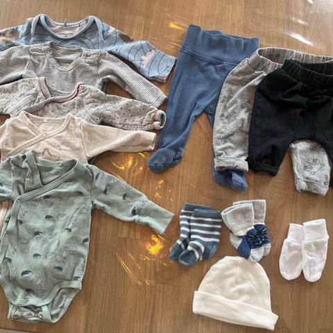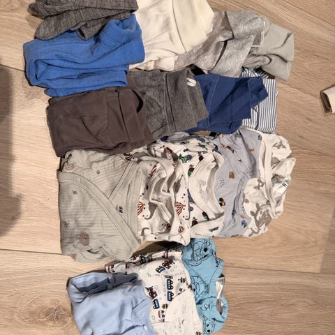 Selger en fin klespakke til nyfødt gutt i størrelse 50. Perfekt startpakke til de første ukene 💙 Totalt 6 sett, 2 jakker og litt ekstra. Klærne er pent brukt, uten hull eller flekker av hva jeg kan se.
