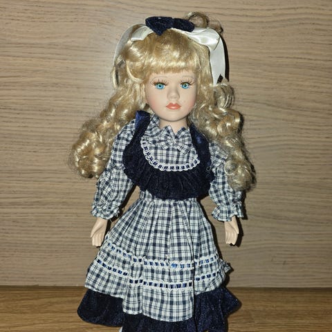 Porselensdukke med blonde fletter, kledd i blå kjole med stripete detaljer og matchende hatt. Dukken har mørke sko og sitter i oppreist stilling. Passer som pynt eller til lett lek. Størrelse er ikke oppgitt av selger.