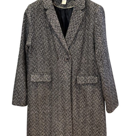 H&M kåpe for dame i størrelse M. Kåpen er grå og laget i polyester. Den har belte i livet og klassisk krage. Mønsteret er i fiskebensvev, og lengden går omtrent til midt på låret avhengig av høyde. Passer som ytterplagg i overgangssesonger eller milde vinterdager, avhengig av lagene under.