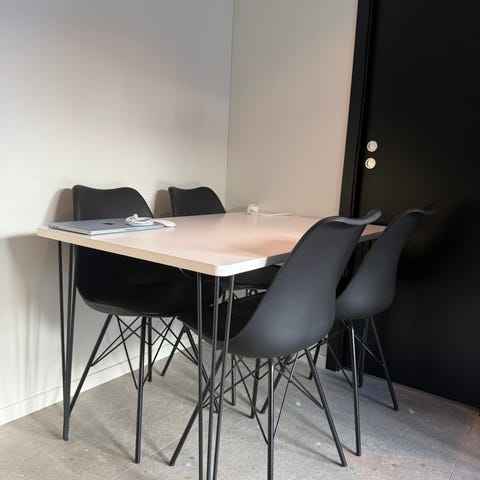 Sort bord, 30L oppbevaringskasser i plast m lokk, 2 stoler,