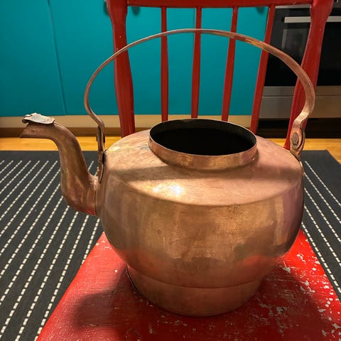 Leksand kobber vannkjele med fast hank. Kjelens utside er i blankt kobber, mens innsiden fremstår lyst belagt/metallisk. Klassisk form med tut og lokk, samt bred bærehank med Leksand stempel. Egnet som vannkjele til komfyr eller som dekorativ bruksgjenstand på kjøkkenet. Ca en liter, passer på Moccamaster kaffetrakter.