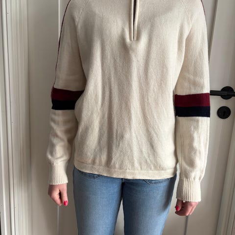 WoolLand genser for dame i størrelse M. Genseren er hvit og strikket i ull. Den har rund hals, lange ermer og et strukturmønster i strikken. Passer til hverdagsbruk og som et ekstra lag på kjølige dager.