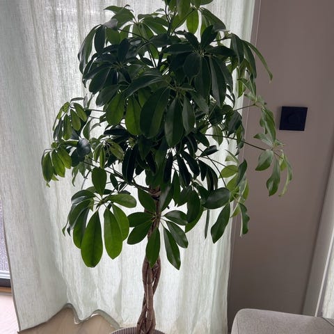 Grønn potteplante med flettet stamme i hvit plastpotte.