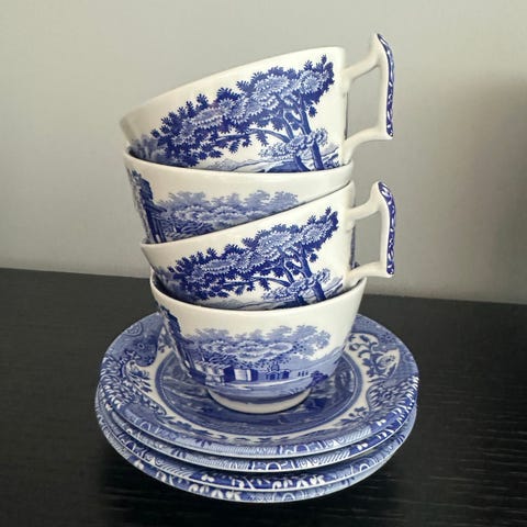 Fire espressokopper med skål, fra Spode Italian Blue, selges samlet.