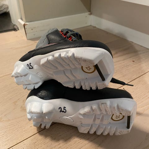 Pent brukte skisko til barn selges. Skoene har glidelås og borrelås, og er polstret. Størrelse 25.