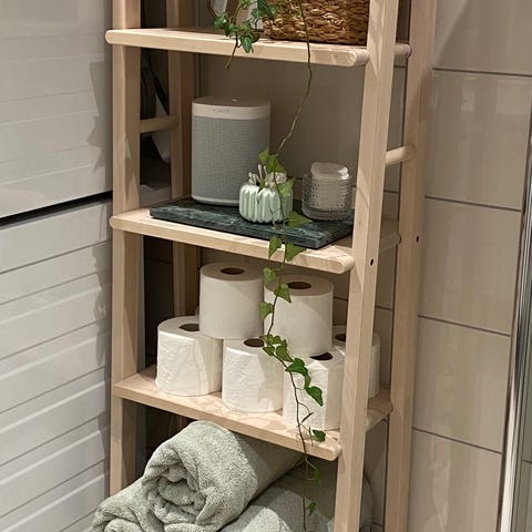 Frittstående hylle i lyst tre med fem åpne hyller. Hyllen har smal og høy utforming som egner seg godt i rom med begrenset gulvplass. Passer til oppbevaring av håndklær, toalettartikler, kurver eller andre mindre gjenstander på bad, vaskerom eller andre rom i hjemmet. Åpen konstruksjon gir god oversikt over innholdet og gjør det enkelt å komme til fra flere sider.