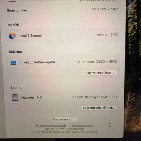Apple MacBook Air 13-tommers bærbar PC med innebygd skjerm på 13,3 tommer (1440 x 900). Modellen er fra 2017 og kjører macOS Monterey versjon 12.7.6. Maskinen har Intel Core i5-prosessor (1,8 GHz tokjerners), 8 GB 1600 MHz DDR3-minne og Intel HD Graphics 6000 med 1536 MB delt minne. Lagringen er en SSD på 121 GB, hvor en del er i bruk av system og programmer.