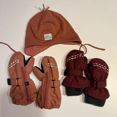 Lue og hansker fra reflex, regnvotter fra okidoki. Luen er 2-5 år, hanskene og votten 2-4 år.