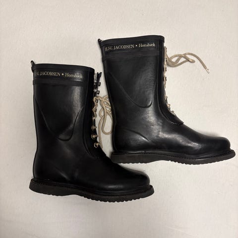 Ilse Jacobsen regnstøvler i størrelse 38. Høye gummistøvler med snørelukking foran og justerbar rem bak. Farge svart med lyse lisser. Laget i gummimateriale med kraftig såle som gir godt grep. Egnet til bruk i vått vær og på regnværsdager.