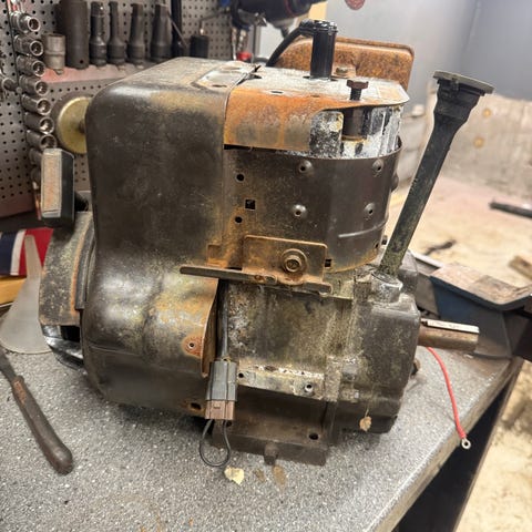 Motorblokk til bensindrevet småmotor med tilhørende deler. Komplett men gjenger er ødelagte i topplokk. Der kan det sikkert settes inn Helicoil. Forgasser er 3 år. Motor har el-start og strømspole i starthus.