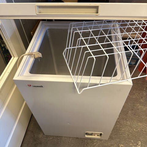 Electrolux fryseboks i hvit utførelse. Fryseboksen har topplokk og en uttakbar trådkurv øverst for enklere organisering av innholdet. Ytre overflate og innvendig kar viser bruksspor. Egnet som ekstra frysekapasitet i bod, garasje eller kjeller. Nærmere tekniske spesifikasjoner som volum og energiklasse er ikke oppgitt.