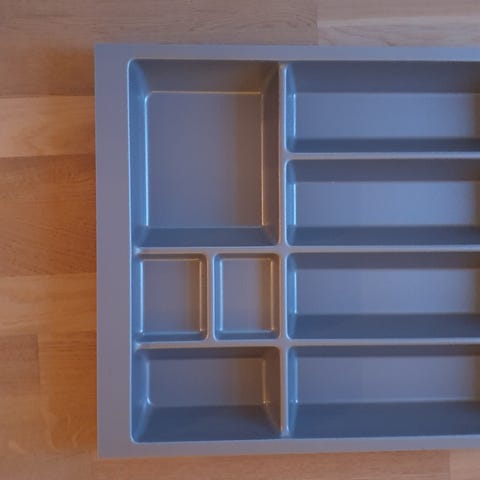 IKEA bestikkholder for kjøkkenutstyr i svart plast. Holderen har flere rom for sortering av bestikk, kjøkkenredskaper eller oppvaskbørste og svamp. Den har perforert bunn i deler av holderen for drenering av vann, egnet til bruk ved kjøkkenvasken eller på benkeplaten for organisering av kjøkkenutstyr.