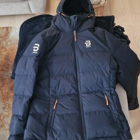Dæhlie dunjakke for dame i størrelse XL. Jakken er svart og fylt med dun, med hette og hel glidelås foran. Den har logoer fra Dæhlie samt trykk med «Trondheim FIS World Cup» og DNB på brystet. Praktiske lommer med glidelås. Egnet som ytterjakke på kalde dager.