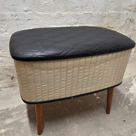 To pene puffer i teak pene og hele med polstret sete. Fra 1967. Store oppbevaringsrom oppi. Perfekte i stua eller på soverommet, gode å sitte på.