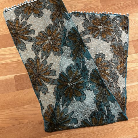 Godt ullteppe uten hull og flekker.Det er løsnet litt av tråd nederst på kanten Str. er bredden er1 meterog 30 cm.Lengden er 1 meter og 87 cm