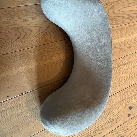 Ergobaby ammepute i grå farge. Puten har buet U-form som gir støtte rundt midjen ved amming eller flaskemating. Myk tekstiloverflate og yttertrekk med håndtak for enkel flytting. Kan brukes som støttepute for både barn og voksen, for eksempel i sofa eller seng.