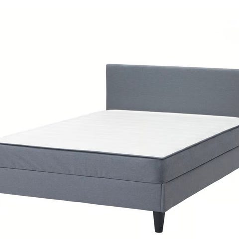 IKEA seng i størrelse 140x200 cm. Sengen har grå tekstiltrekk og rette linjer med enkel sengegavl. Den står på fire ben som gir plass under sengen til oppbevaring (ett femte ben midt under) eller enkel rengjøring. Passer som dobbeltseng eller romslig enkeltseng i soverom eller gjesterom. Medfølger god overmadrass. Pent brukt, Må hentes.