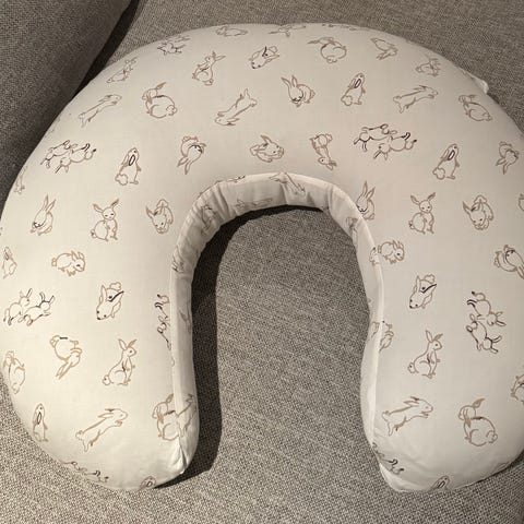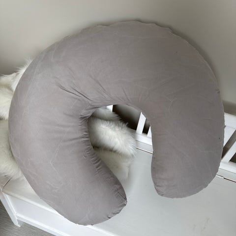 Färg & Form ammepute i grå med hvite prikker. U-formet pute som gir støtte ved amming eller flaskemating. Trekket har prikkemønster og er avtagbart, og puten kan også brukes som støttepute for barnet eller som avlastning for nakke og rygg for voksne. Egnet til bruk i stol, sofa eller seng.