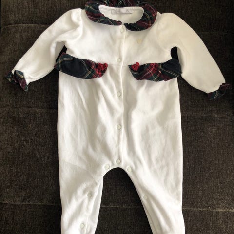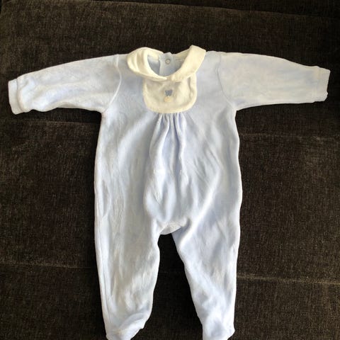 Pysj med fot og knapper i lyseblå velur fra Patachou. Str 68 (6 mnd). Pent brukt og vasket med parfymefritt vaskemiddel.