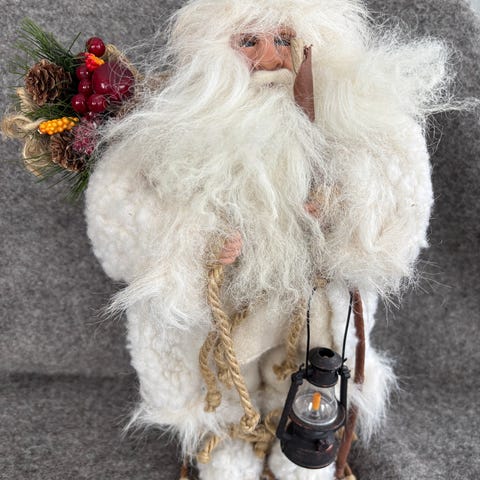 Fin nissefar i hvit og grå, ca. 40 cm høy.