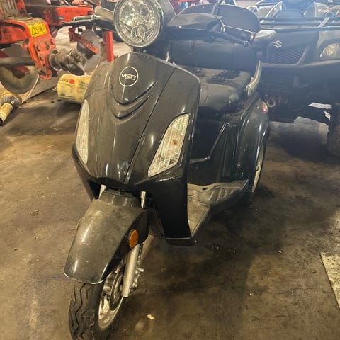 E-Wheels elektrisk trehjulsscooter i rød farge. Modellen har tre hjul, høy ryggstøtte og sete med armlener. Scooteren er utstyrt med speil, frontlys, baklys og blinklys. Det er fotbrett med sklisikker overflate og felger i metallutførelse. Egnet som elektrisk scooter for én person til bruk på vei eller gangarealer der dette er tillatt. Passer voksne brukere som trenger stabil og motorisert transport over korte og mellomlange avstander.