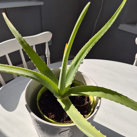 Aloe vera grønn potteplante i plastpotte. Planten har lange, smale blader med taggete kanter. Leveres i grønn plastikkpotte med dreneringshull og oppbindingspinne (potteskjuler i glass følger ikke med). Egner seg som inneplante på lyse steder med moderat vanning.