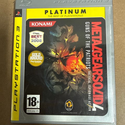 Konami Metal Gear Solid 4: Guns of the Patriots Playstation 3 spill. Action- og snikespill utviklet for Playstation 3-plattformen. Spillet er i Platinum-utgave og har aldersgrense 18 år (PEGI 18). Leveres på Blu-ray-disk i original eske for PS3.