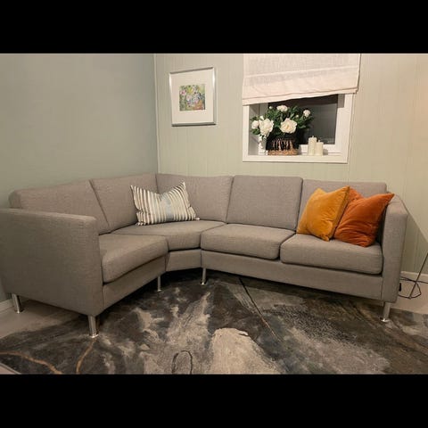 Top Line Jupiter modell med nakkestøtte og pall. Mål: 2,10x2,10m. Høyde 70cm. Sittehøyde 44cm. Dybde 54cm. Pall 40x54 cm. Trekk på alle puter kan tas av og vaskes. Pent brukt.