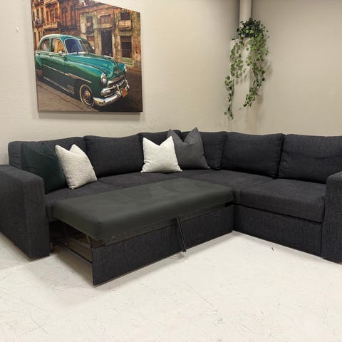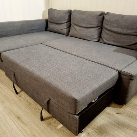 Hjørnesovesofa i grått tekstil. Sofaen har sjeselong med oppbevaringsplass under sitteflaten, egnet for lagring av sengetøy eller puter. Under hoveddelen er det en uttrekkbar del som kan trekkes ut til dobbeltseng. Sofaen har tre ryggputer og armlene i hver ende. Nøytral grå farge som passer inn i de fleste stuer eller gjesterom.