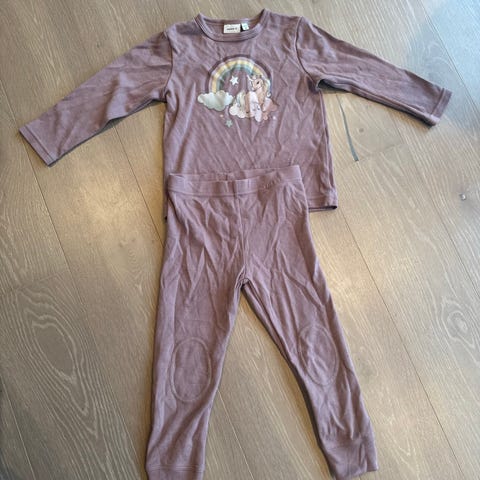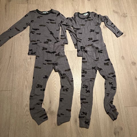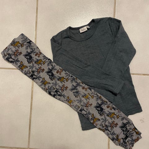 Name it ullsett for gutt i størrelse 110. Sett med genser og longs i grå merinoull. Genseren har rund hals og motiv med dinosaurer foran. Longsen har strikk i livet og forsterkning på knærne. Materiale ifølge lappen er merinoull.