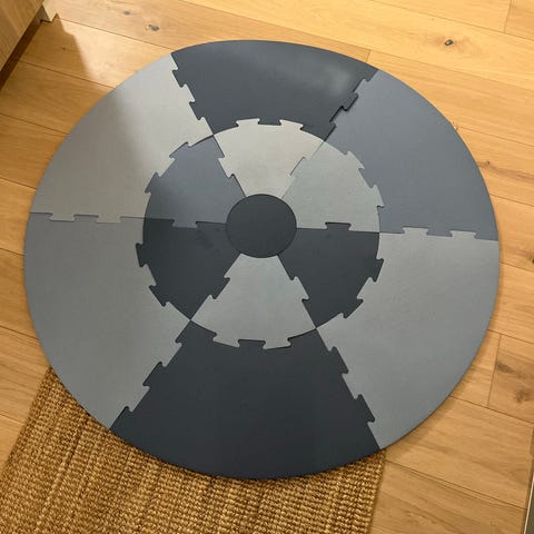 Rund Sebra lekematte. Laget av skumplastmateriale som gir en myk og trygg overflate for barn. Passer til bruk som lekematte innendørs, perfekt til å ha babygym på. 13 puslespillbiter. Ø120 cm. Tykkelse ca 1,5 cm. Noen små hakk i noen av delene - se bilder. Ellers i god stand.