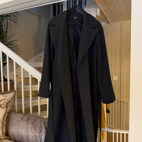 Ellos kåpe for dame i størrelse M. Kåpen er svart og laget i polyester. Modellen har krage, belte i livet og vide ermer. Lengden går omtrent til leggen, og innsiden er helfôret for økt komfort. Passer som ytterplagg i overgangssesonger og mildere vinterdager.