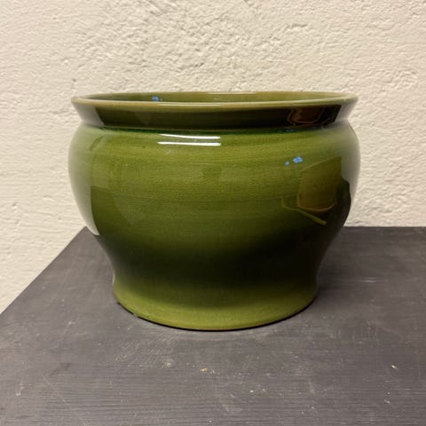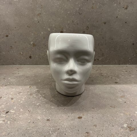 Blomsterpotte i form av et hode i svart farge. Potten har åpning på toppen til plante eller dekor og står på en integrert fot. Passer til innendørs bruk som dekorativ plantepotte eller som skulpturelt interiørelement. Materialet fremstår som hardt og solid (for eksempel keramikk eller kompositt, stein). Den er ganske tung, så må nok hentes i Oslo.