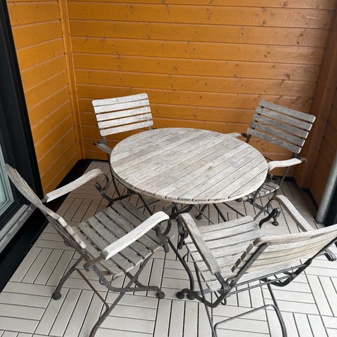 Hagesett med to stoler og bord i hvit tre. Stoler kan slås sammen.