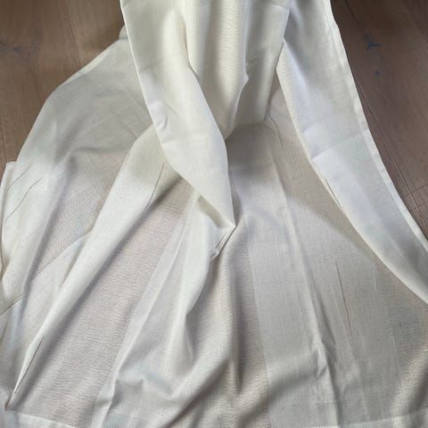 Kid løper i hvitt polyesterstoff med vevd, lett transparent struktur. Tekstilet har et diskret rutemønster i vevingen. Egnet som bordløper på spisebord, skjenk eller andre overflater innendørs. Materiale ifølge merkelapp: 100 % polyester. Vaskes og vedlikeholdes etter anvisning på merkelappen.