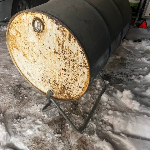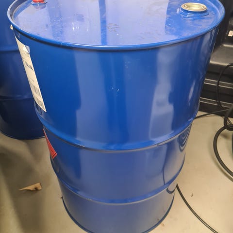 Svart plastfat med lokk og to skrukorker på toppen. Fatet har en kapasitet på ca. 200 liter og er egnet til oppbevaring av væsker eller andre materialer etter behov. Laget i hardplast og kan brukes i garasje, verksted eller lignende miljøer der det er behov for et større oppbevaringskar.