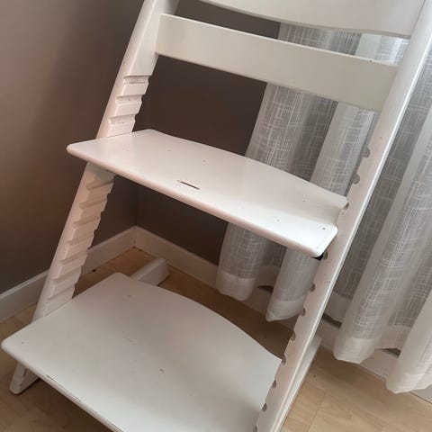 Stokke Tripp Trapp stol i hvit. Har en del bruksmerker i malingen, men dette har ingenting å si for bruken. I god stand. Kompatibelt med ekstrautstyr til baby. Må hentes.