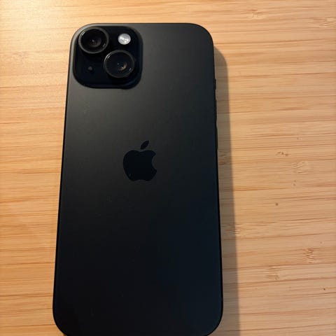 Apple iPhone 15 mobiltelefon med 128 GB lagringsplass. Modellen har svart front og bakside, dobbelt kamera på baksiden og helskjermdesign med Face ID på forsiden. Egnet for vanlig daglig bruk som samtaler, meldinger, surfing, sosiale medier, foto og video, samt bruk av ulike apper og tjenester fra App Store.