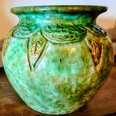 Knall grønn glasert urne med lokk.