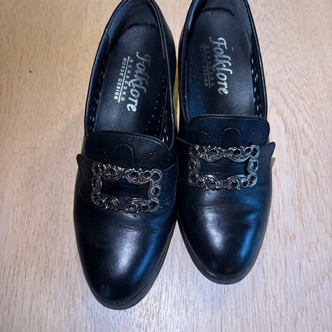 Skoene er godt brukt, og derfor noe slitt. De kan fint brukes som de er, eller repareres da det er skinnsko.