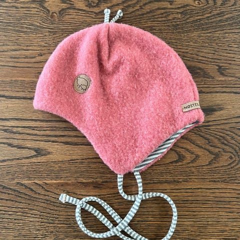 Kivat lue til jente i størrelse 00, som tilsvarer 3-6 mnd. Lua er rosa og strikket i ull, med knyting under haken for å sitte godt på hodet. Den har mykt fôr på innsiden i bomull.
