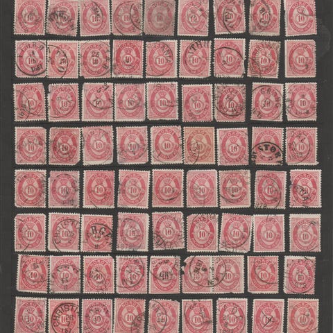 Norge Postfrim 50 øre frimerker lot. Ulike nyanser i brunfarge. Samling av brukte norske frimerker med pålydende 50 øre, motiv med posthorn og krone. Frimerkene har stempelavtrykk, egnet for videre sortering og innordning i samling. Antall og kvalitet fremgår av bildene. Selges helst samlet.