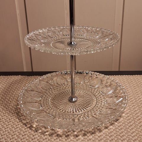 IKEA KVITTERA etasjefat i glass. Treetasjes fat med rund bærestang på toppen. Mål ca. 31 x 27 x 34 cm. Egnet til servering av kaker, frukt, snacks eller andre småretter ved borddekking og buffet. Leveres i original eske med glassfat og tilhørende deler for montering.