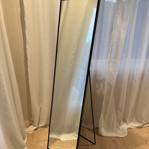 IKEA speil. Frittstående speil med rektangulær form og enkel, skråstilt fot som gjør at speilet kan stå. Nøytralt og minimalistisk design som passer i de fleste rom, for eksempel bad, soverom eller entré.